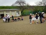 二人一組で大きな輪をもって走ります。班の担当の先生の体を通してもどります。輪をバトンにして次のペアにつなぎます。初めての練習でしたが、とてもよくできました。