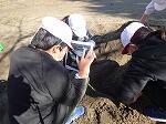 5年生が、校庭の砂場で流れる水の働きについて調べる実験をしました。