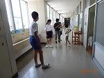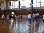 グループに分かれて自己紹介した後、それぞれ校内たんけんへ出発しました。「ろうかが広いよね?」「手すりが太いよ。」「机が高いね。」「教室が広い。」「校庭は部屋小の方が広いよ。」など、中学生と話しながら楽しく案内してもらいました。次に体育館でドッジビーをしました。優しい中学生とのゲームはあっという間で、「もう1回やりたい。」と何人もが訴えていました。