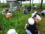 1年生の農園はひまわりやヒャクニチソウ、2年生は野菜畑、3年生はホウセンカ、4年生はヘチマ、5年生はカボチャが大きく育っています。6年生はジャガイモの収穫が終わり、今日は校庭の除草を行いました。梅雨時で曇ってはいましたが、大きな草と格闘していると、汗が噴き出てきます。
