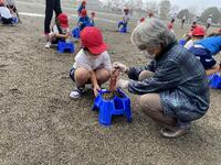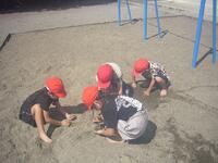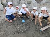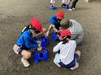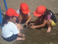 図工の単元で、裸足になり砂場で活動をしました。さらさらの砂を使って城を作ったり、水で砂を濡らし泥を使ってどろだんごを作ってみたりと、楽しく活動しました。いつもとは違う活動に、目を輝かせてたくさんの笑顔を見ることができました。