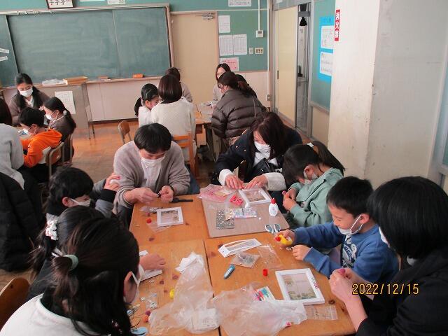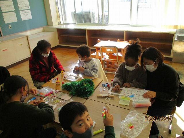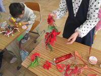 あさがおのつるをリースにして、クリスマスリースを作りました。持ってきた材料を使って素敵なリースが出来上がりました。ぜひ、お家で飾ってみてください。