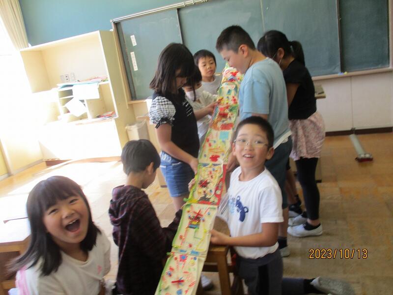最後に全員の板を繋げてビー玉を転がしました。