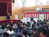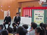 この日の業間に、真新しい体育館に子どもたち全員が集まり、たくさんのおはなしを聴きました。演目は次の通りです。