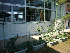 ○4年生が育てている、ひょうたんに小さな実がつきました。
