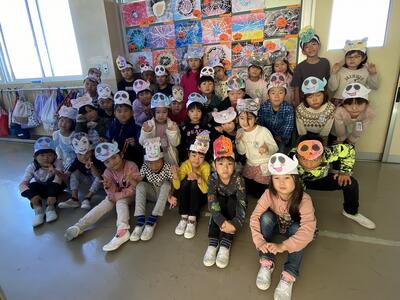 魔女に扮したセーラ先生と手作りお面で仮装した1年生で楽しく活動しました。