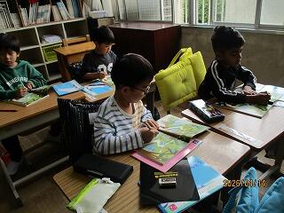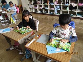 体育の後は、図書室に本を借りに行きました。本の種類の多さに、子供達はとても驚いていました。