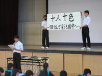 令和7年度生徒会活動スローガン「『十人十色』~個性で彩る岩中へ~」が発表されました。生徒会長の挨拶では、「岩舟中学校を動かすのは私たち生徒一人一人です。」という言葉が印象に残りました。生徒会活動目標である「岩舟中学校の新たな基盤を作る!」に向かって取り組んでいきます!