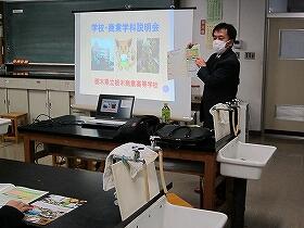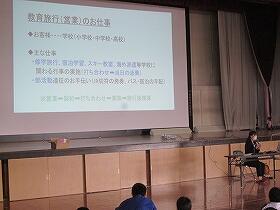 今回、2年生の希望者を対象に高校説明会を開催しました。これは栃木商業高校が2年生のために学校、学科の説明をしていただけるということでお願いしたもので、商業系の学科に興味がある生徒13名ほどが参加し、詳しい学習内容や施設について説明を受けました。