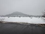 予報通りというか、やや早めに降り始まった雪がうっすらと積もりました。富士山も降る雪でかすんだように見えます。