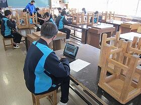 令和5年度の3年生が実施する全国学力学習状況調査には英語が加わり、「話すこと」が調査が行われます。タブレットとヘッドセットを使って英語で答える調査で、そのための事前検証が行われました。全員のタブレットがログインできて解答が録音できるかを確かめます。