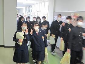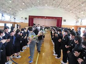 令和4年度、第48回卒業式が行われました。在校生送辞、卒業生答辞と進み、涙ぐむ卒業生の姿が多く見られました。最後の卒業生による合唱は思いのこもったすばらしいものでした。今用意できる写真は歓送の時の写真だけです。すみません。式の写真は用意ができましたら掲載していきます。