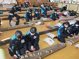 琴の音が聞こえてきました。その音色は1年生が音楽の授業で実際に奏でているものでした。素人には理解できない楽譜のようなもので弦を押さえるところ、弾くところが決まるようです。