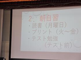 担任による授業参観の後、今度は学級懇談です。1年生は入学してからの様子を中心に、2、3年生はそれに加えて1か月後の学年行事の話も。40分では足りないくらいでした。