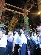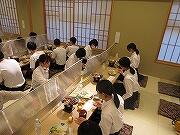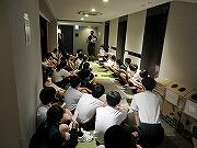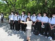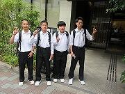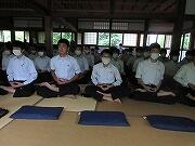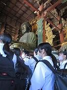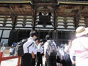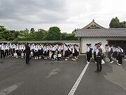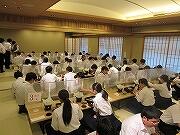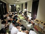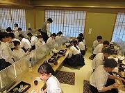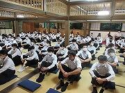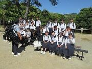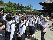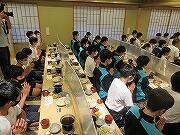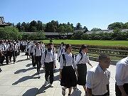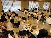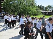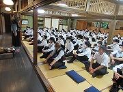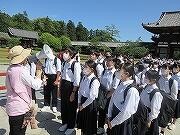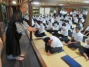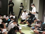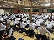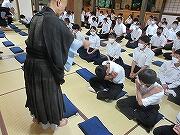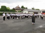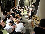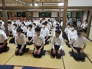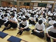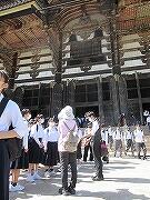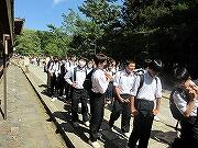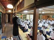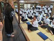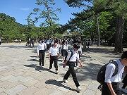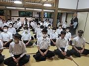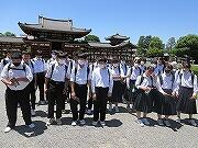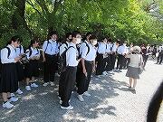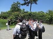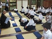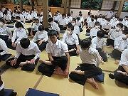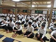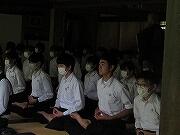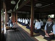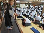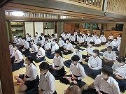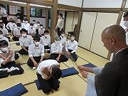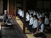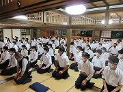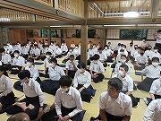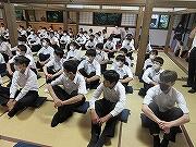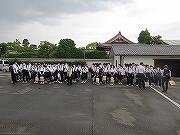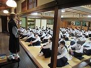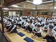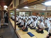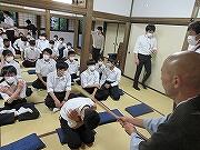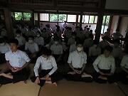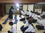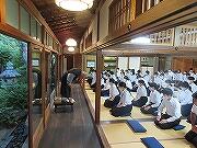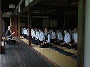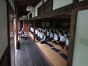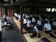 グループ別行動を終えて全員が元気に妙心寺の駐車場に戻ってきました。その後、妙心寺の退蔵院で座禅を体験しました。お坊さんのお話の後、約15分間、薄暗い中で何も考えずに無の境地というのを味わいました。時間内と終ってから、ほとんどの生徒が警策で両肩を叩いていただきました。今日は夕方少しだけ雨に降られてしまったのが残念でした。