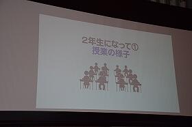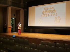 今日はコスモスホールで1年生の学年PTAが行われました。第1部では校外学習の報告を生徒がパソコンを使って行い、楽しかった様子がうかがえ、集まった保護者の方も微笑みながら見入っていました。