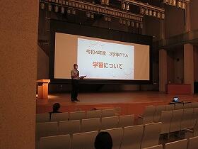 本日、コスモスホールで多くの保護者の方にご参加いただいて3年生の学年PTA研修会が行われました。第1部ではマザーはうすの助産師である天谷一美様を講師にお招きして「親子で考える生と性」と題してお話をいただきました。なかなか親子で考える機会の少ないであろう題目をストレートにお話しいただいて、いいきっかけになったものと思います。第2部では学習・進路・生活についての話の後、先日行われた修学旅行を振り返りました。楽しかった3日間が昨日のことのように思い出されました。