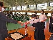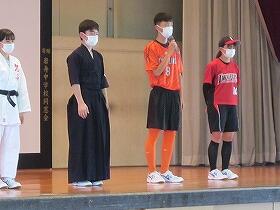 2学期の始業式を体育館で行いました。1学期終業式は放送での実施でしたが、今回は表彰も多くありましたので、感染対策を十分に行い、換気をし、間隔を広くとって実施しました。まず各学年代表生徒から2学期の抱負を発表してもらいました。それぞれの学年らしく、決意のような強い意識・意志を感じるような抱負で頼もしく感じました。その後の表彰では、夏の大会、吹奏楽コンクール、文化連盟祭、歯と口の健康週間の表彰を行い、弓道部の関東大会準優勝の報告をしてもらいました。