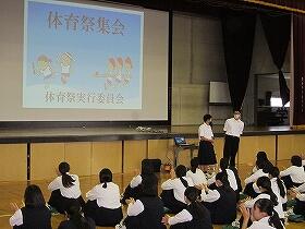 10日後に迫った体育祭のついての集会を行いました。実行委員長と副委員長から日程や種目等いろいろな連絡があり、近づいてきたことを実感できました。最後には旗の合図による動き方について説明がありました。明日からは全体練習が始まります。
