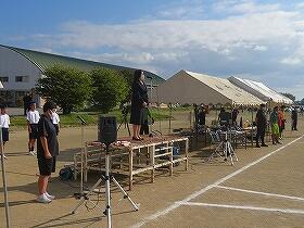 絶好の体育祭日和の下、体育祭が行われました。コロナの関係で午前中のみの開催、保護者の参観は1家族2名までではありましたが、生徒は一つ一つの競技に全力で取り組み、素晴らしい友情とクラス愛を見せてくれました。まずPTA本部役員の方の駐車場の誘導、次に開会式前に本日着任された横田由美恵先生のご挨拶をいただきました。