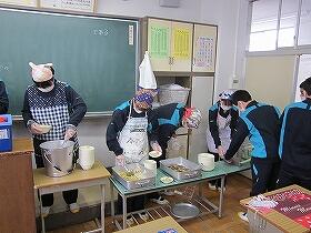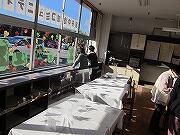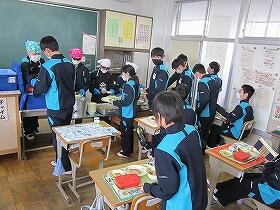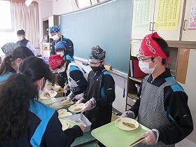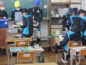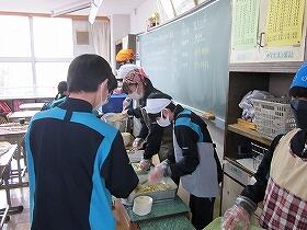 2学期の最終週に入り、給食当番は自前のエプロンと頭覆いを用意して配膳しています。いい感じで似合っています。