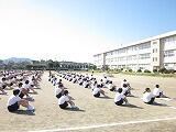 南舎前のトラックでは3年生、東門付近のソフトボール場では2年生、南側のサッカー場では1年生が練習しています。ほとんどのクラスが、声を掛け合いながら長縄跳びの練習をしています。初めは連続で5回程度しか跳べませんでしたが、今は20回以上跳んでいるクラスもあります。体育祭に向けて、雰囲気も盛り上がってきました。