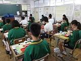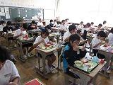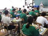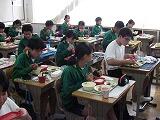 テーマメニューはクラスごとにテーマを考え、それをもとに話し合って献立を決定します。今日は1年3組のテーマメニュー 「 元気1000倍 もりもりメニュー 」 でした。献立は、ごはん・牛乳・鶏肉のごまだれ焼き・磯香和え・さつまいも入り豚汁・ぶどうでした。コロナウイルスに負けない体をつくるために、栄養バランスも良く、パワーがもりもりと漲ってくるようなメニューを考えてくれました。