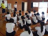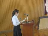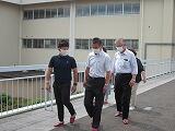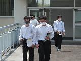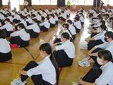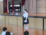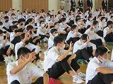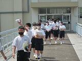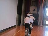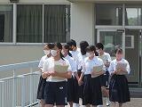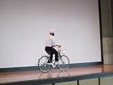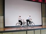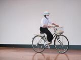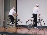 交通委員会の生徒が実際に自転車に乗り、並進しないことや見通しの悪い場所では一時停止することを実演し、正しい乗り方を確認しました。最後に、交通委員長が生徒全員にマナーを守って自転車に乗るように呼びかけました。