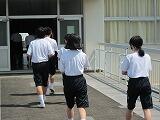 2階渡り廊下は痛みが酷く、危険であったため、8年前から通らないようにしていました。その後、市に改修工事をお願いしていましたが、昨年度末に改修工事が終わりました。5月の生徒総会において2階渡り廊下の通行を許可してほしいという提案があり、生徒が話し合い、通行のルールを決めました。渡り廊下に通じる扉が開いていると、明るく開放的な雰囲気になります。渡り廊下を通っていた1年生から、移動が楽になったという声が聞こえてきました。