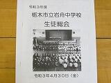 4月30日(金)、生徒総会を行いました。まず、栃木生徒会長から、令和3年度の生徒会スローガン『岩中展開』~僕らの新化は無限大!~ について、「進化」ではなく、『新化』という言葉を選んだ理由の説明がありました。そして、良き伝統を継承し、岩舟中学校をより良くしていくために、意見箱の設置やビューティフルマンデー、アルミ缶回収などを行っていくという方針が示されました。