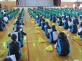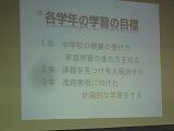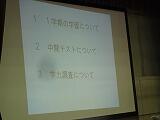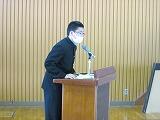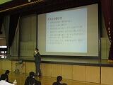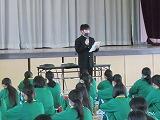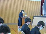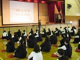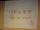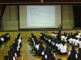 学習委員長のあいさつ、学習委員からの話の後、学習指導担当の川又教諭が学習についてパワーポイントを使って説明をしました。主に1学期の学習、中間テスト、学力調査の3点の話でした。また、家庭学習の習慣を身につけるために、インターネットやゲーム等のメディアの利用を平日は1時間以内にするように話がありました。生徒は集中して話を聴いていました。