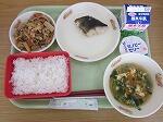 今日の給食は、たけのこごはん、牛乳 ホッケの文化干し、にら玉汁、