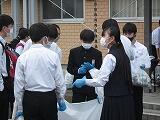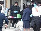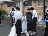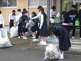 生徒会役員と各学級の代表生徒が、体育館前で生徒が持ってきたアルミ缶の重さを量り、クラスごとに記録しました。集まったアルミ缶を足でつぶして、大きな袋に集めました。小雨が降っていましたが、たくさんの生徒が協力してくれたおかげで、多くのアルミ缶が集まりました。アルミ缶回収で得たお金は、今後のボランティア活動で活用します。