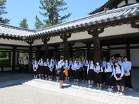 京都駅からバスに乗り、高速道路で奈良に向かいました。混雑もなく、最初の目的地である法隆寺に到着。昼食をとって、最古の木造建築物を見学しました。