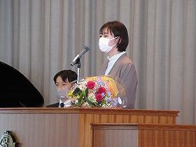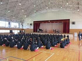 今までお世話になりました先生方とお別れする離任式を行いました。今回は9名の先生方とお別れすることになり、生徒代表の感謝の言葉と花束贈呈を行い、お一人ずつご挨拶いただきました。そして岩舟中校歌を全員で歌い、お見送りをしました。