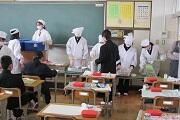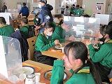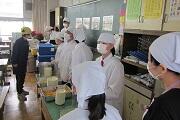 やはり最初の給食は定番のカレーでした。1年生は少し大きめの白衣を着て給食当番が配膳してくれましたが、35人もの人数の配膳は初めてで、どのくらい配ればよいのかわからず苦労していました。