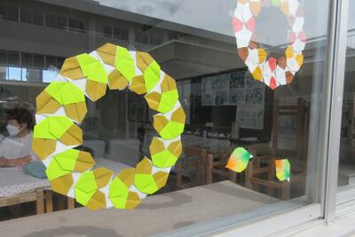 いつものように「つるの会」の方々が地域コミュニティ室の模様替えをしてくださいました。今回は秋の装いということで、ドングリを折った色紙を組み合わせてリースの形になっています。そして黄色の色紙でイチョウの葉を、グラデーションになった色紙を使って紅葉していく葉を添えました。