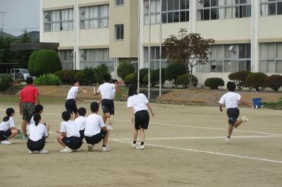 3年生が体育の授業で体育祭の練習をしていました。最初はバトンパスの練習をして、その後全員で走ってみました。トラックを走ると真剣みが増すようです。そして次に長縄です。まだまだ始まったばかりなので連続して跳ぶのは大変そうですが、これから1週間で3年生は仕上げてくるでしょう。