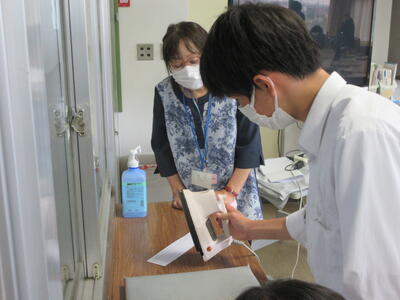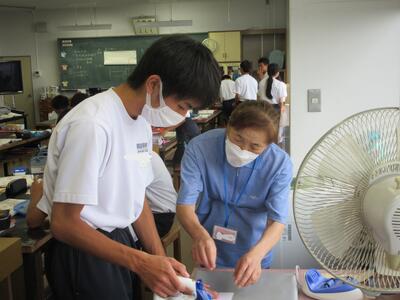 今日は2年生の家庭科の授業に5名のボランティアの方に来ていただきました。エコバッグ制作の前の段階としての練習だったようです。一人ひとりていねいに教えていただいていたので、実際のバッグ制作が楽しみです。