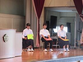 70日間の1学期が終了しました。各学年の代表の生徒が1学期の反省と、これからの夏休み、2学期に向けての抱負・心構えを発表してくれました。最後に生徒会から今まで集めてきたアルミ缶の収益金で車いすを寄付することが発表されました。併せてペットボトルキャップの回収を2学期から始めたいので協力してほしいとお願いがあり、拍手で承認をしてもらって、回収活動を進めることが決まりました。