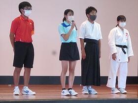 いよいよ明後日から本格的に総体の地区大会が始まります。もうすでに女子ソフトテニス部は3日にスタートしていますが、その他の部はこれからです。そこで各部の部長さんがユニフォームを着て、最後の大会に向けての抱負を力強く発表しました。吹奏楽部も30日にコンクールがありますので、そこに向けての抱負を、クラブチームは複数の競技・チームがありますが代表で抱負を述べました。そして最後に生徒会役員から全ての部に向けてエールが送られました。