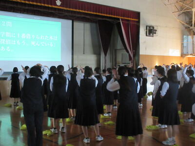 昨日、図書委員会による集会が行われました。図書室で多く借りられている本のランキングの発表の後、図書に関するクイズを行いました。今は読書週間です。この機会に多くの本に触れてほしいと思います。