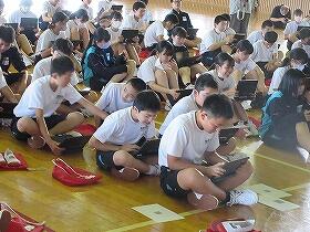 2年生が市役所健康増進課の方に来ていただいて歯と口の出前講座を行いました。内容は「むし歯」予防のための講話と顎模型を利用したブラッシング指導です。タブレットを使って自分の歯の写真も撮ってみました。