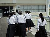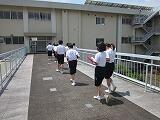 2階渡り廊下は痛みが酷く、危険であったため、8年前から通らないようにしていました。その後、市に改修工事をお願いしていましたが、昨年度末に改修工事が終わりました。5月の生徒総会において2階渡り廊下の通行を許可してほしいという提案があり、生徒が話し合い、通行のルールを決めました。渡り廊下に通じる扉が開いていると、明るく開放的な雰囲気になります。渡り廊下を通っていた1年生から、移動が楽になったという声が聞こえてきました。