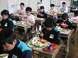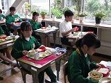 先週の3日間は給食なしの午前中の授業でしたが、今週は短縮日課の6時間(水曜日は5時間)になります。そのため、今日が2学期はじめての給食でした。今日の献立は、ごはん、牛乳、マーボー豆腐、焼き餃子、バンサンスーでした。生徒は手指消毒をして無言で配膳し、全員でいただきますをしてからマスクを外しました。久しぶりの給食でしたが、グループで食べることはできず、全員が前を向いての黙食になりました。