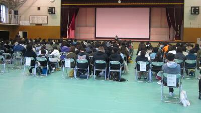 令和6年度に入学してくる現在の小学校6年生とその保護者の方を対象に進学説明会を行いました。まず教務主任から入学までのことについて説明し、そのあと生活面と学習面について、そして集金について担当から説明しました。休憩をはさんでから生徒会役員による説明になりました。これは6年生からの質問に対する回答という形で行い、身近な先輩が説明することもあって、少しは中学校への不安が取り除けたのではないかと思います。