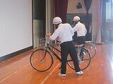 交通委員会の生徒が実際に自転車に乗り、並進しないことや見通しの悪い場所では一時停止することを実演し、正しい乗り方を確認しました。最後に、交通委員長が生徒全員にマナーを守って自転車に乗るように呼びかけました。