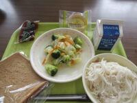 今日の給食の献立は「ミニ黒食パン・牛乳・ひやしそうめん絵文字:キラキラ・めんつゆ・ヘルシーサラダ・レモンカスタード絵文字:笑顔タルト」でした。デザートには、さっぱりレモン風味のタルトもついていました。
