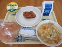 今日の献立は「スライスまるパン・牛乳・チキンたつた・ノンエッグタルタルソース・洋風たまごスープ」で、そこに『レモン絵文字:星牛乳アイス絵文字:キラキラ』がつきました。