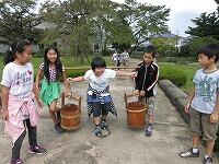 水運び。体験したのは一人10mほどですが、実際は毎日8kmも運んでいたそうです。